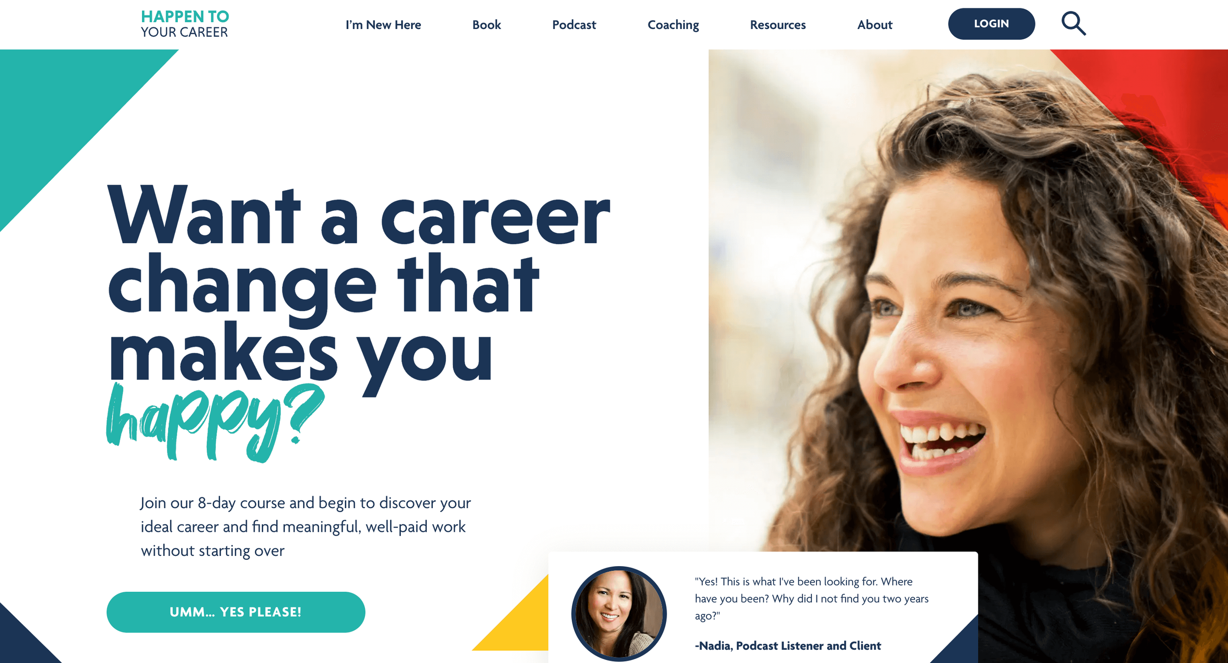 Why it works: When you land on this site, you feel like, "Okay, this company is legit." The branding is on point. They've been featured in major publications. The whole thing looks professional. The site also offers a lot of free resources to educate their ideal clients. They have a podcast, an 8 day email course, and a blog. Great job on the content marketing side. The one thing I would change about this site is making the Login button less prominent and swapping it for a different call to action, like the Coaching page.