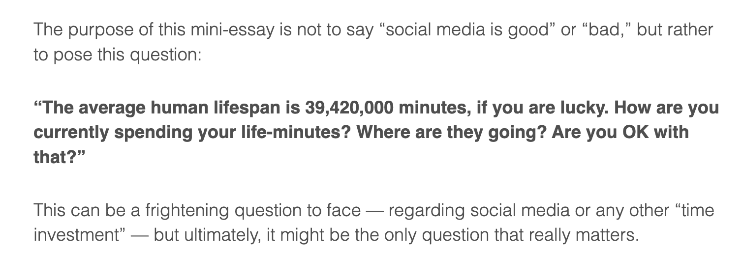 I did some math and realized that if I spent about an hour a day on social media, that's over 15 days every year. And I started thinking about other ways I could use that time. I could be out in nature, spending time with my wife, working out, or writing.
